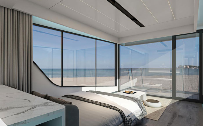 | Interior equipment | 1、Fully-finished house decoration include environmental floor,ceilling and wall,top brand wires,water tube, lamps, sanitary ware,air conditioner,water heater,toilet,shower facilities,smart curtain etc. 2、Smart Control System:Whole-house voice smart control,smart door lock,smart curtain. | ||||